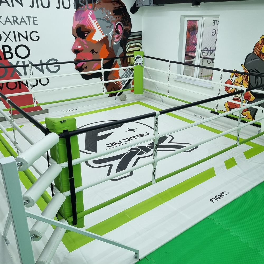 - Боевой размер ринга (размер по канатам) составляет 4х4 метра, что является минимальной рекомендованной для тренировок и клубных соревнований.