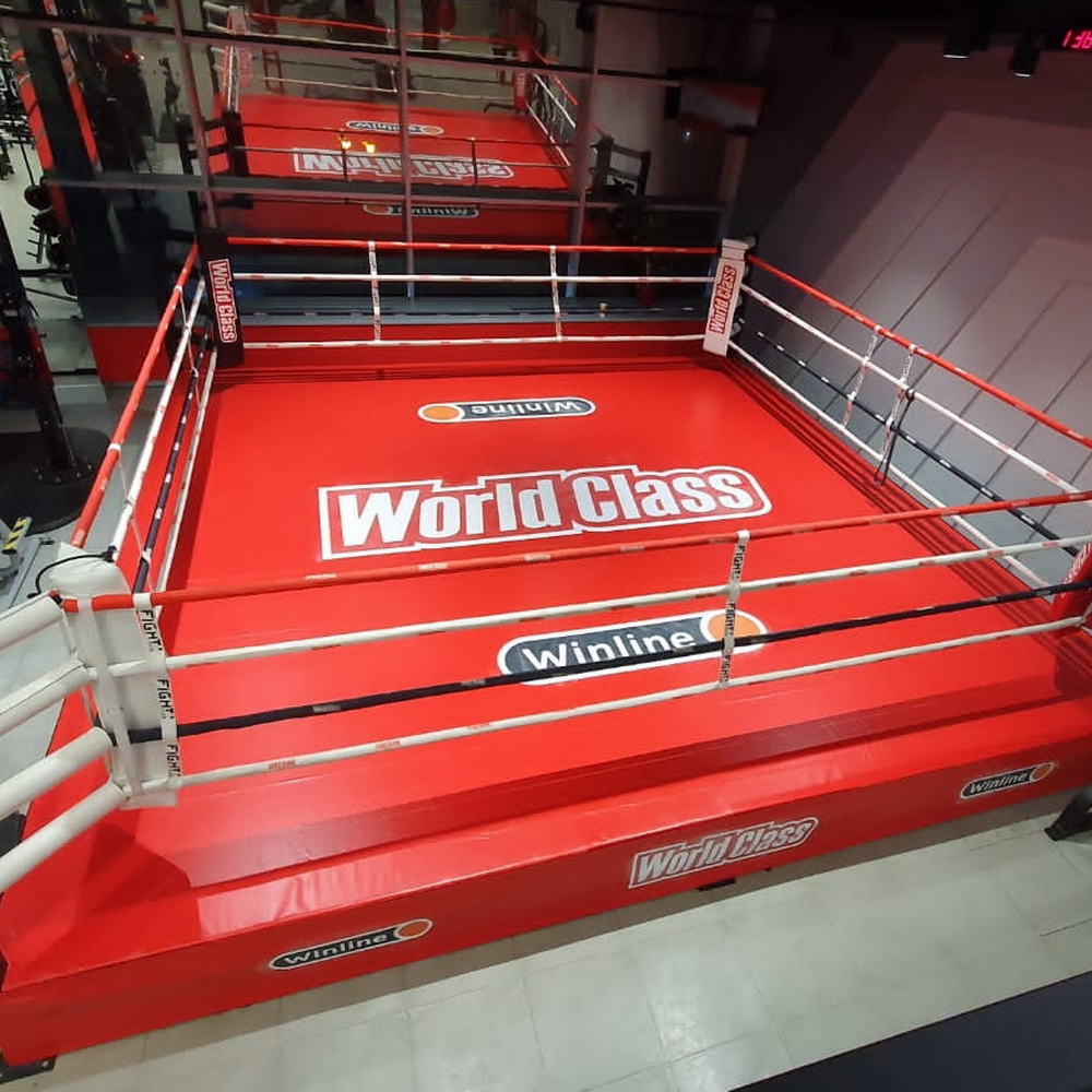 Высота конструкции может быть от 20см до 1м в зависимости от высоты потолков в помещении и задач, которые ставят пользователи. Ринг высотой от 60см комплектуется лесенками для подъёма на помост. Размер ринга составляет 6х6 метров, а боевая зона (размер по канатам) составляет 5х5 метра.