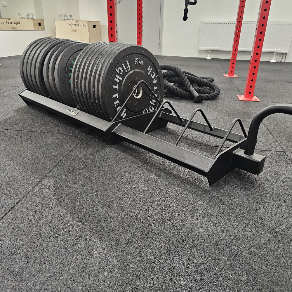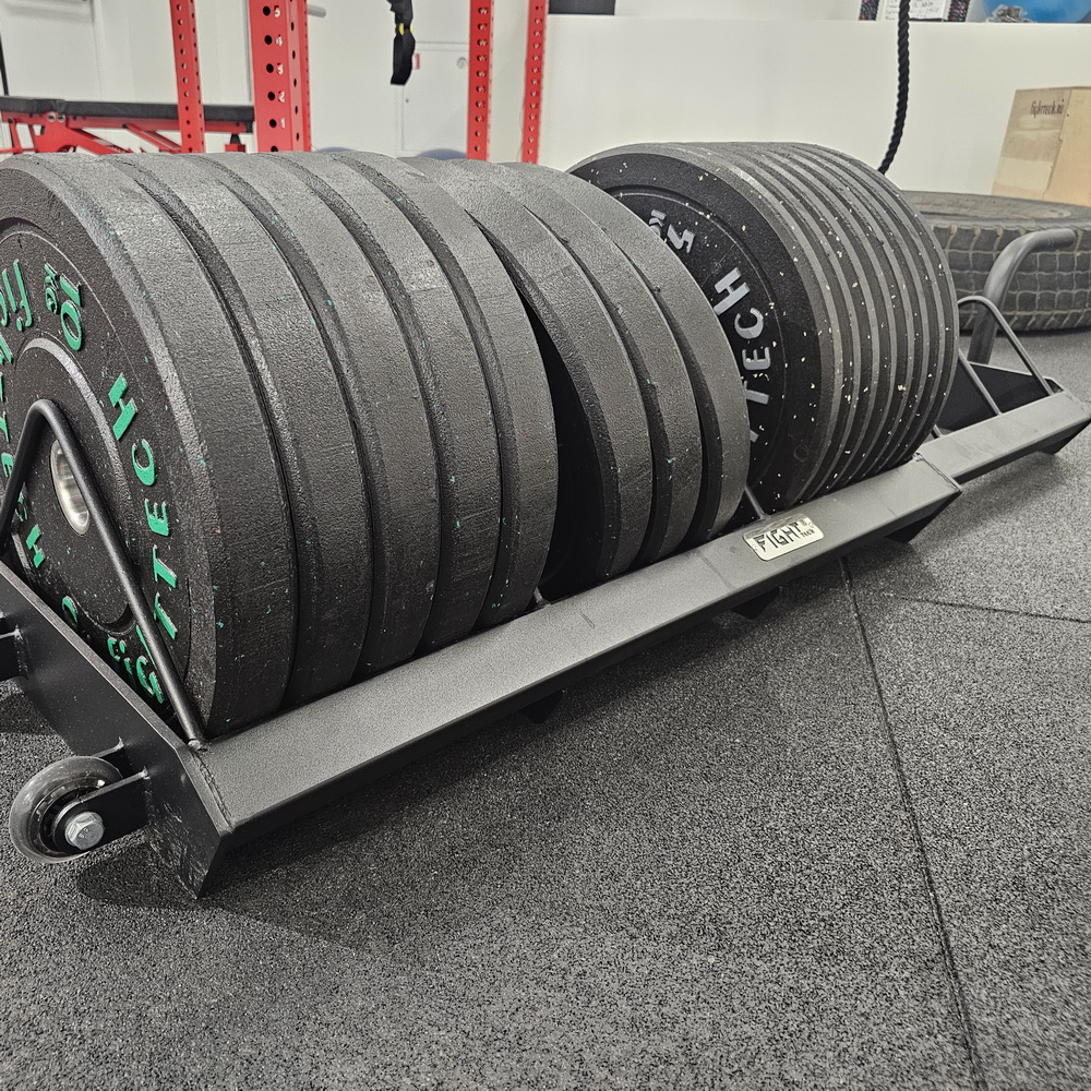 Подставка под диски олимпийского стандарта. Удобная ручка и колеса делают очень удобным процесс их перемещения по спортивному залу.